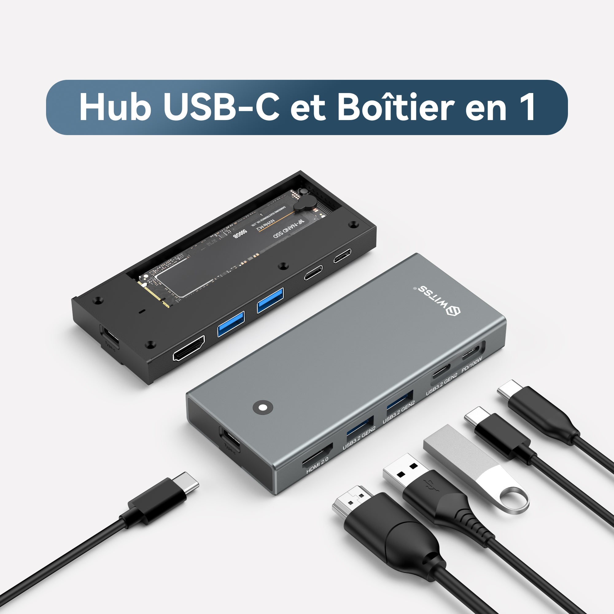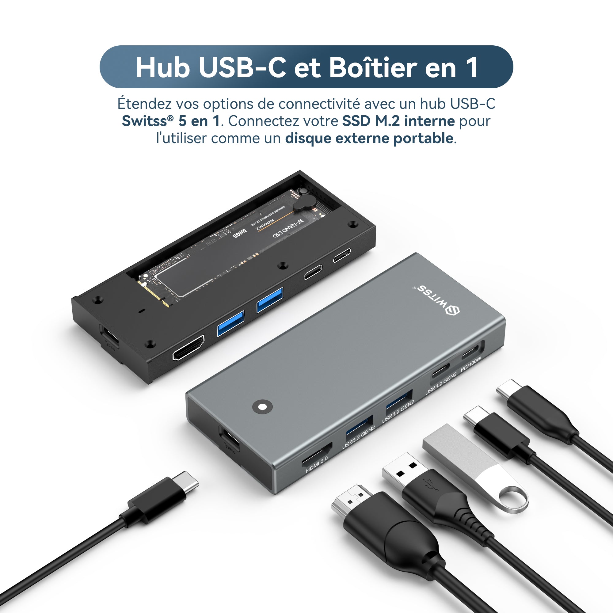 Switss® - Hub USB-C 5 en 1 avec boîtier SSD M.2 intégré