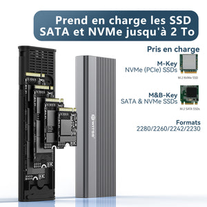 Ce boîtier prend en charge aussi bien les SSD NVMe (PCIe) que SATA (NGFF) avec interface M-Key ou M+B-Key. Il est compatible avec les formats 2230, 2242, 2260 et 2280, et prend en charge une capacité maximale de 2 To.