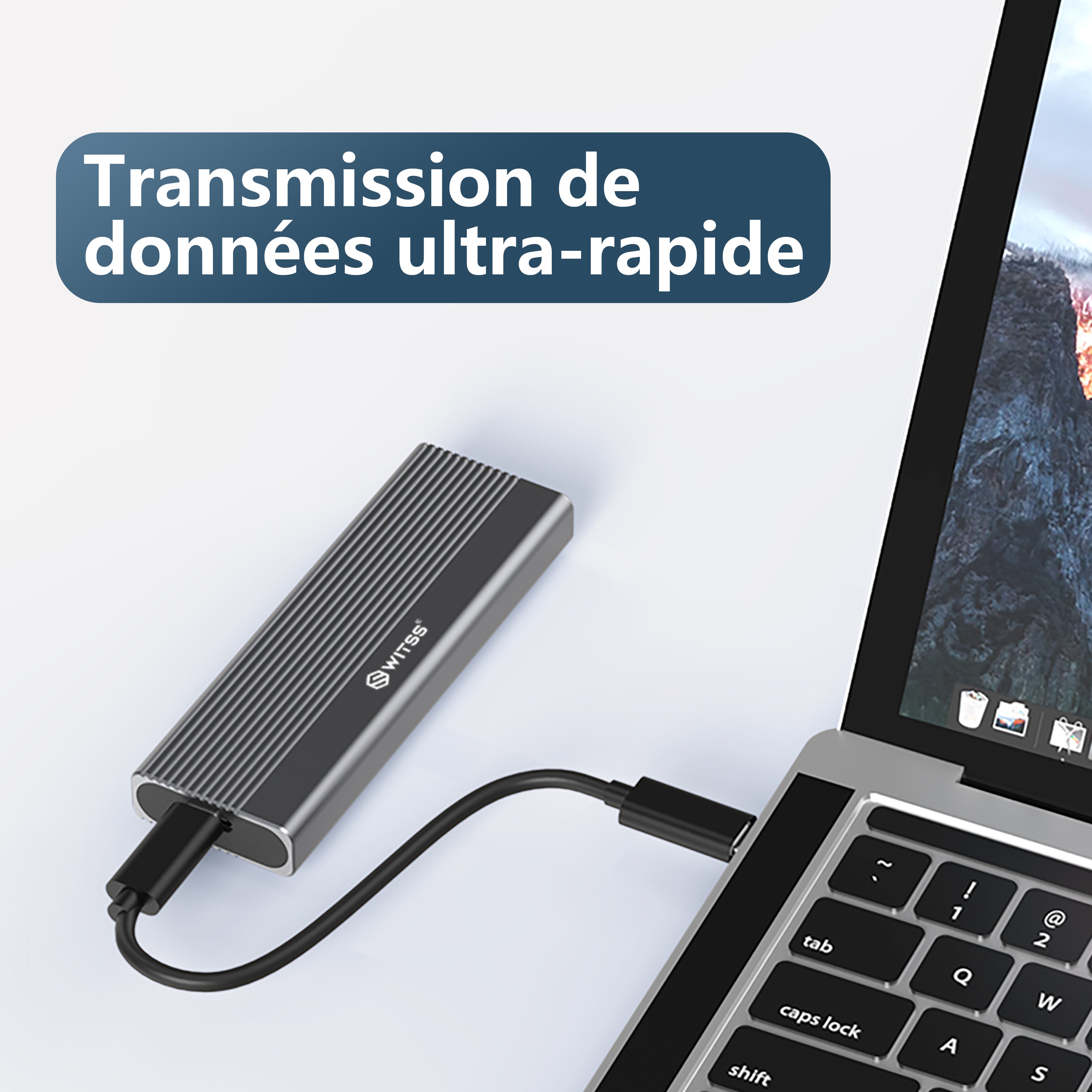 Doté d’un port USB-C 3.2 Gen 2, ce boîtier offre des vitesses allant jusqu’à 10 Gbps, avec des vitesses de lecture jusqu’à 1050 MB/s et d’écriture jusqu’à 1000 MB/s. Un fichier de 1 Go peut être transféré en quelques secondes vers votre ordinateur portable, PC de bureau ou console de jeu.