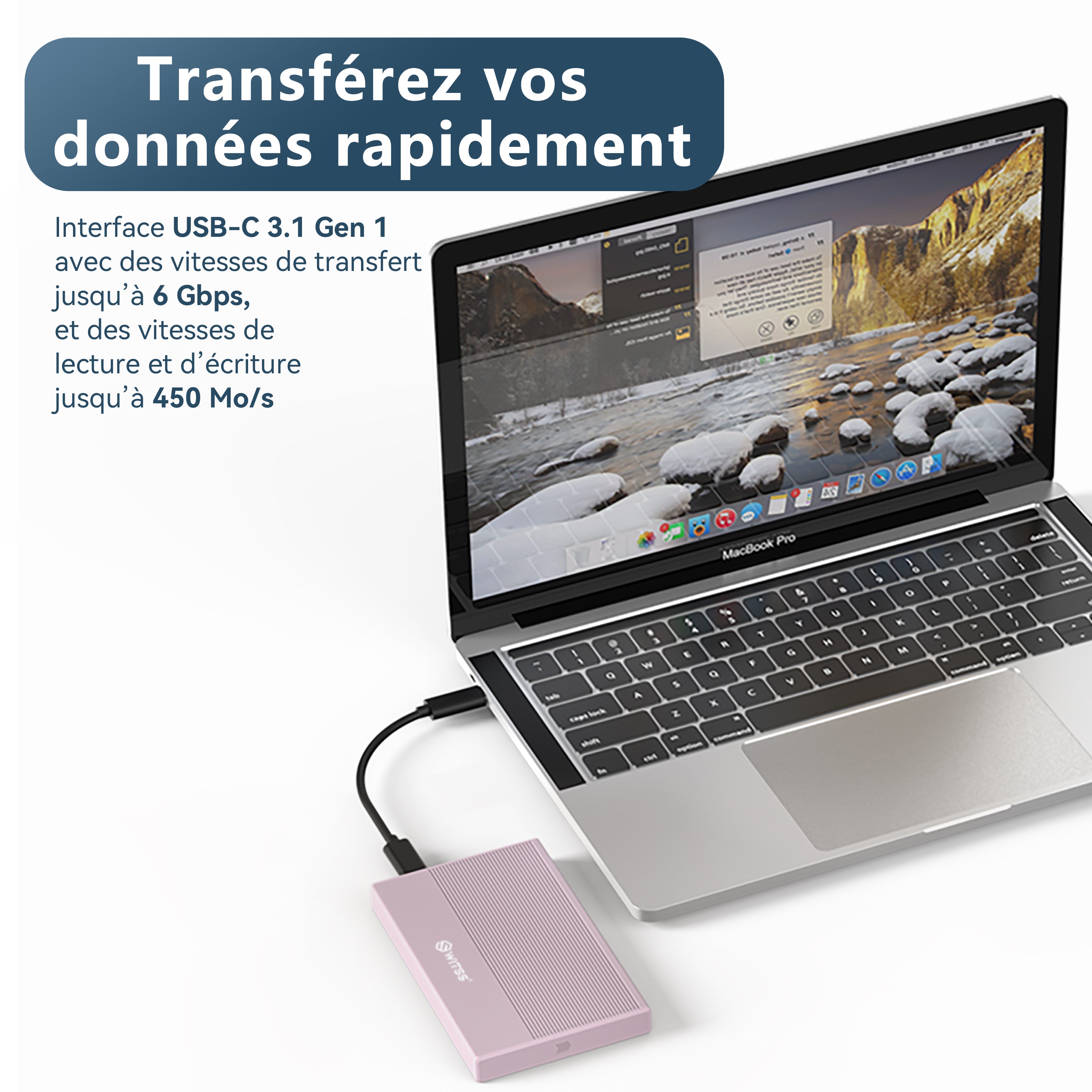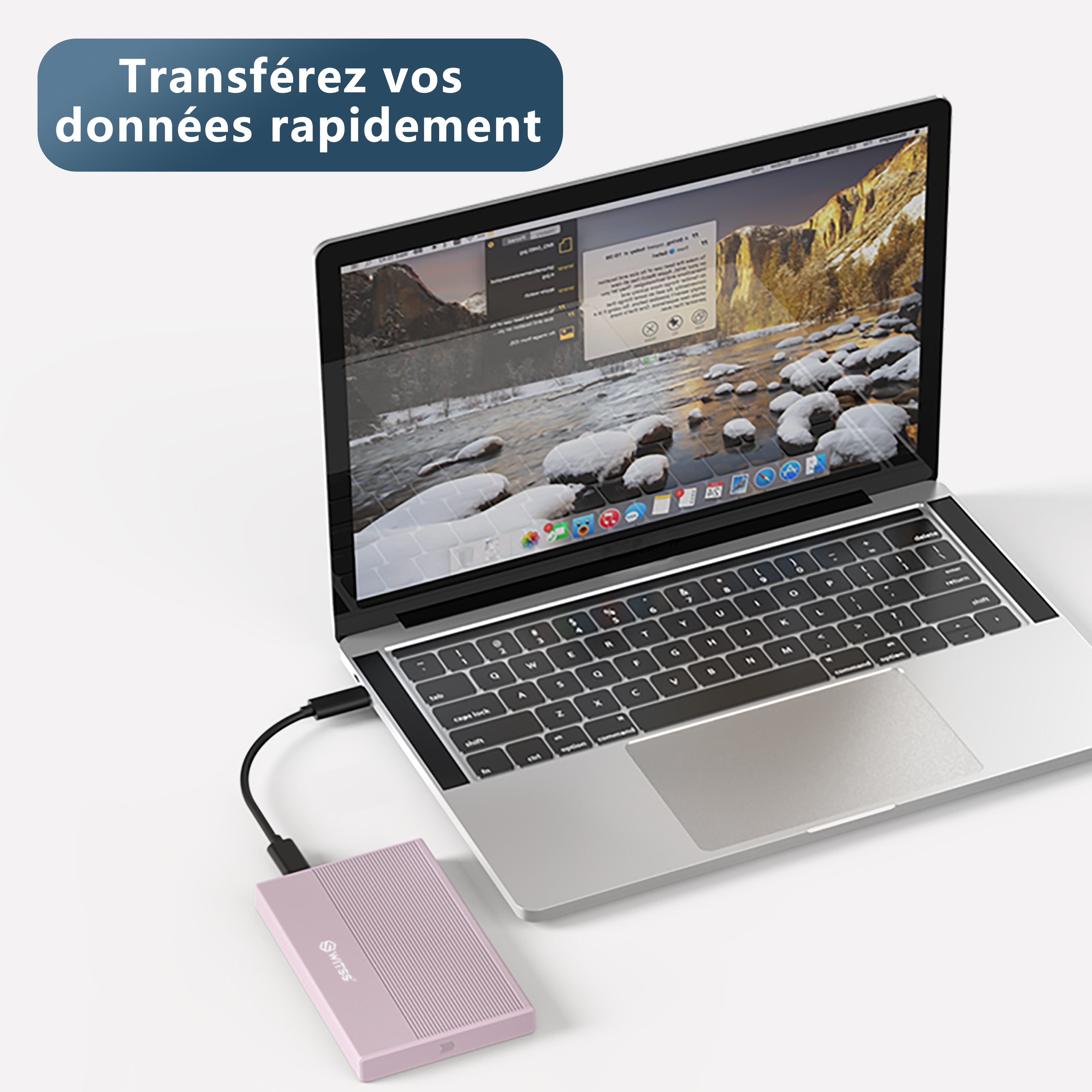 Ce boîtier est compatible avec tous les disques durs et SSD SATA 2,5 pouces jusqu’à 4 To de capacité. Grâce à la prise en charge du SATA III et du protocole UASP (USB Attached SCSI Protocol), vous bénéficiez d’un transfert de données plus rapide, d’une charge CPU réduite et de temps de chargement plus courts.